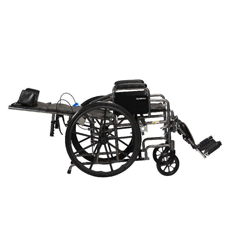 The DynaRide Reclining Wheelchair offer the durability of a lightweight wheelchair frame with the added versatility and comfort of a full reclining back. The steel construction with hydraulic reclining mechanism allow for infinite adjustments up to 180 degrees, inclusive of a locking back bar keeping the back rest from hammocking. The Reclining Wheelchairs are available with a detachable arm with padded arm rests.