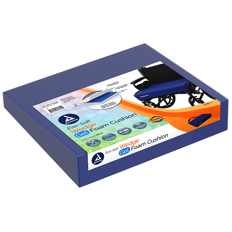 The Dynarex Ever-Soft Gel Foam Wedge Cushion is a high-density foam wheelchair cushion with an embedded dual-chamber gel-pod designed to help prevent and manage pressure injuries in wheelchair-bound patients. The cushion features an angled design to help provide proper seat positioning and prevent forward sliding in a wheelchair.