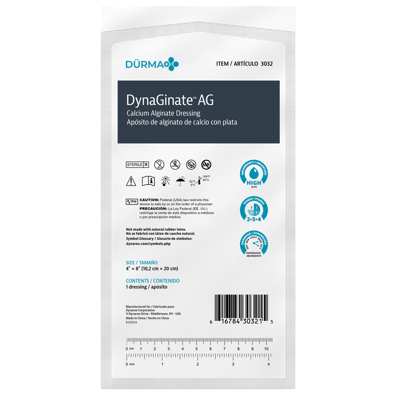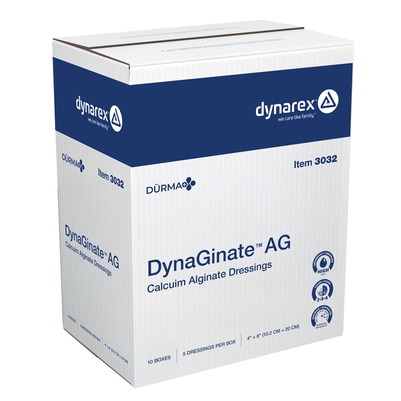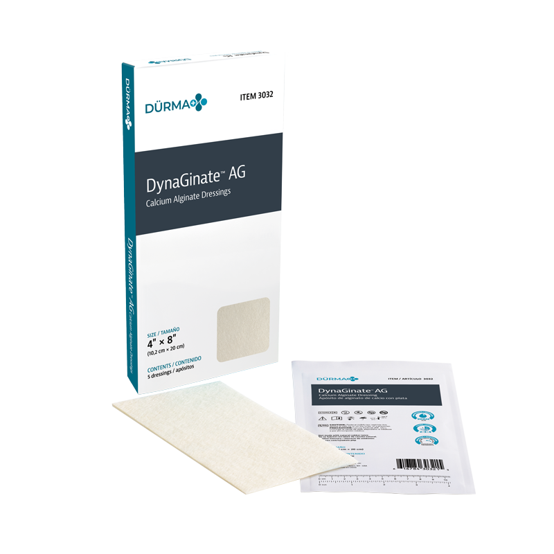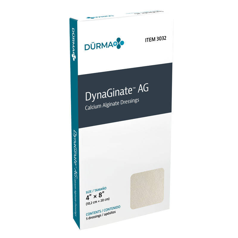 Dürma+ DynaGinate AG Silver Calcium Alginate Dressings are advanced wound care solutions formulated with a combination of calcium alginate and ionic silver. Upon contact with wound exudate, the dressing transforms into a soft, gel-like barrier that conforms to the wound bed and supports an optimal moist healing environment. The silver ions provide an antimicrobial effect, making these dressings suitable for infected wounds or those at risk of infection. Ideal for managing partial- and full-thickness wounds at stages 3 and 4, these high-absorbency dressings are available in several pad sizes for coverage and as a strip for wound packing.