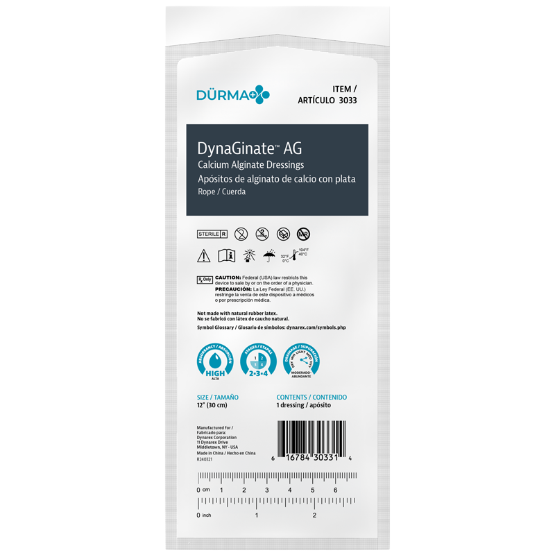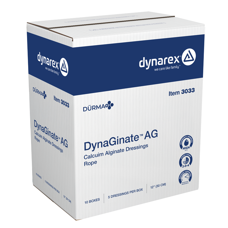 Dürma+ DynaGinate AG Silver Calcium Alginate Dressings are advanced wound care solutions formulated with a combination of calcium alginate and ionic silver. Upon contact with wound exudate, the dressing transforms into a soft, gel-like barrier that conforms to the wound bed and supports an optimal moist healing environment. The silver ions provide an antimicrobial effect, making these dressings suitable for infected wounds or those at risk of infection. Ideal for managing partial- and full-thickness wounds at stages 3 and 4, these high-absorbency dressings are available in several pad sizes for coverage and as a strip for wound packing.