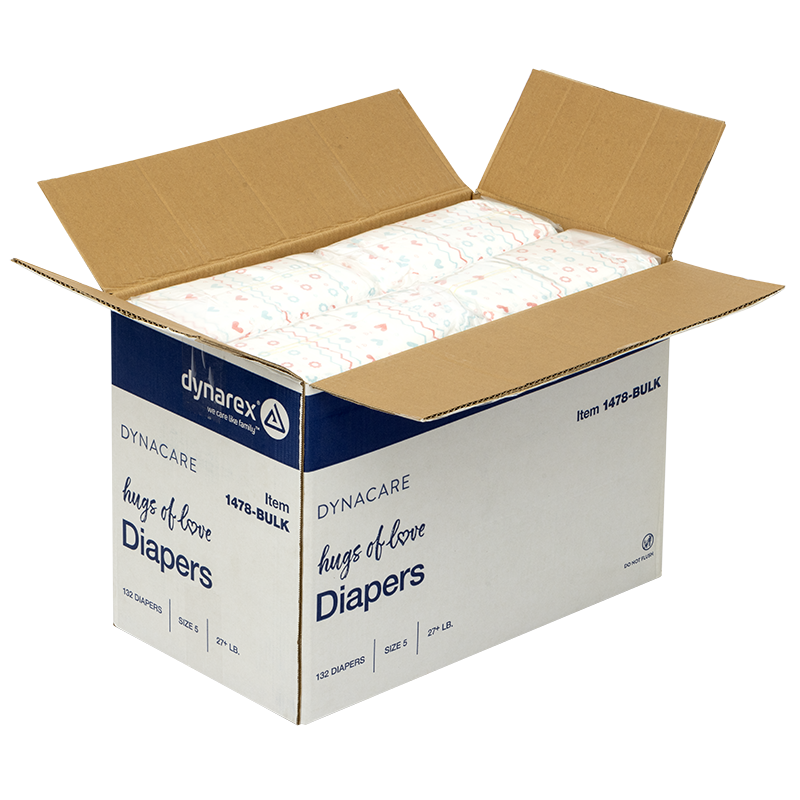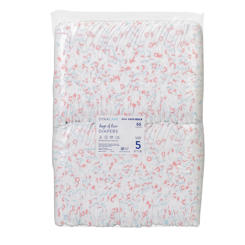 DynaCare Hugs of Love Diapers are designed from soft, breathable materials with a highly absorbent core, offering reliable protection and gentle comfort for delicate skin. The diapers feature a convenient wetness indicator to allow for easy monitoring.