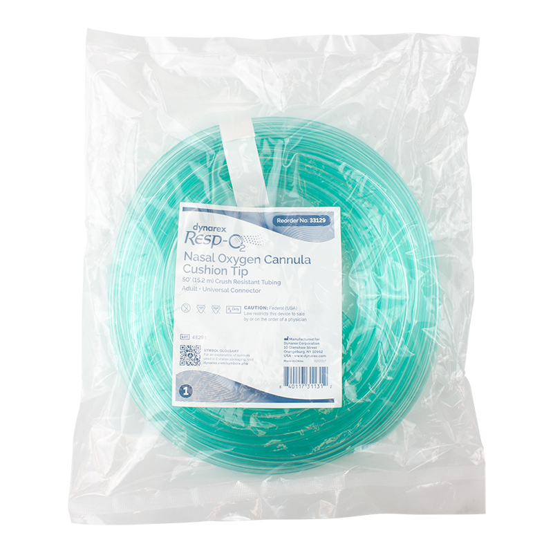 Dynarex Resp-O2 Nasal Oxygen Cannulas with Cushion Tips are designed to efficiently deliver supplemental oxygen to respiratory patients. The cannulas come with either Standard or Universal connectors and feature light green oxygen supply tubing, designed to help improve tube visibility.