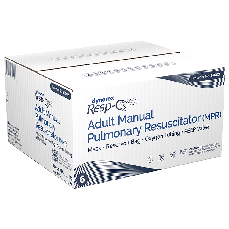 Dynarex Resp-O2 Manual Pulmonary Resuscitators (MPR) are premium-grade medical devices designed for resuscitation and life support measures performed by qualified medical professionals. The lightweight, single-patient MPR bag features a textured design to provide a non-slip grip and comes pre-assembled with 10 feet of oxygen tubing and soft cushioned facial mask.