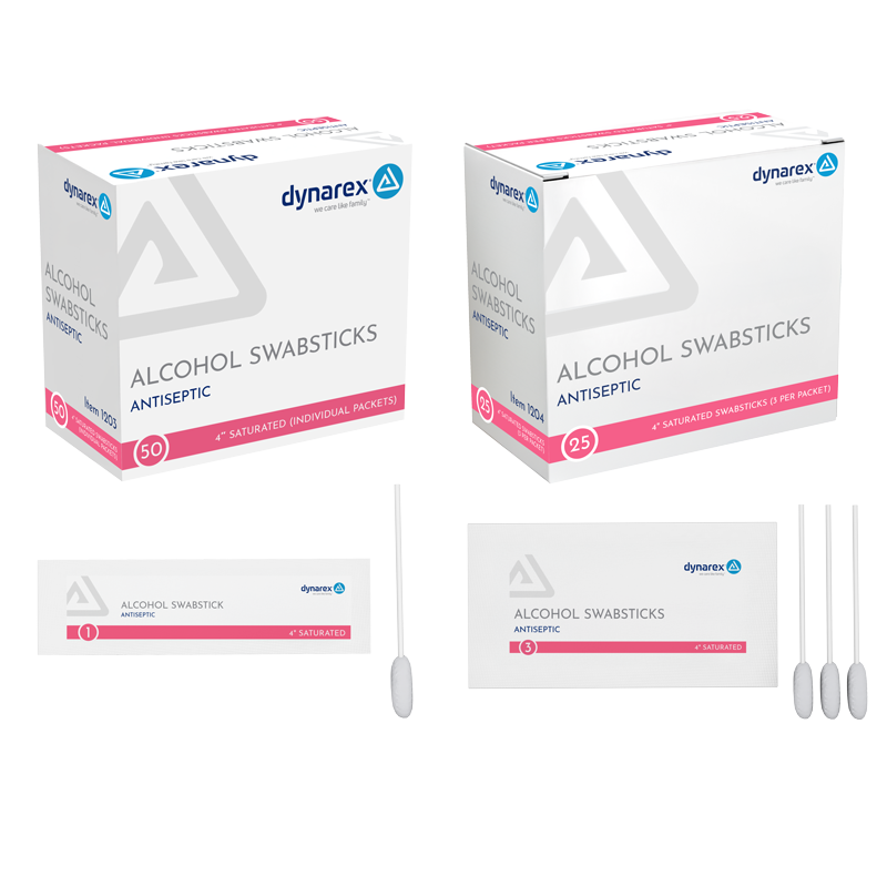 Dynarex Alcohol Swabsticks are designed for safe and effective skin cleansing in preparation for minor medical procedures. Each antiseptic Swabstick features a soft, absorbent tip saturated with 70% isopropyl alcohol to help reduce bacteria. These premium-quality Swabsticks are packaged in convenient, easy-to-open foil packets for quick access. Ideally sized for easy portability in travel bags and first-aid kits for optimal convenience.