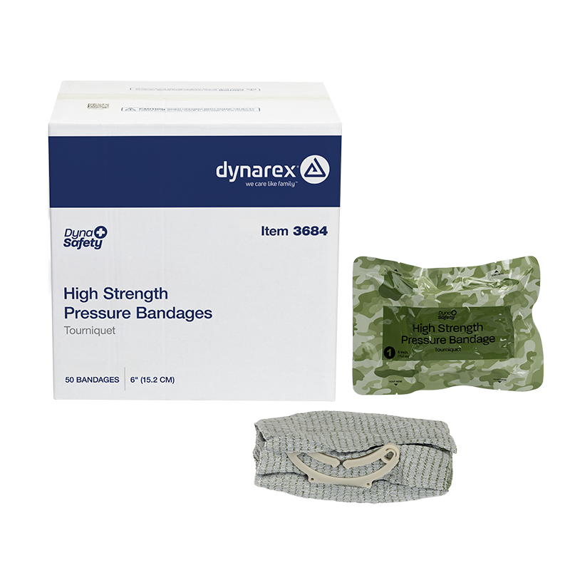 Dynarex DynaSafety High Strength Pressure Bandages are designed to wrap heavy bleeding wounds when firm compression is needed. Each Israeli-style Bandage features a non-adherent pad, elastic bandage, pressure applicator, and closure clip for all-in-one wound protection.