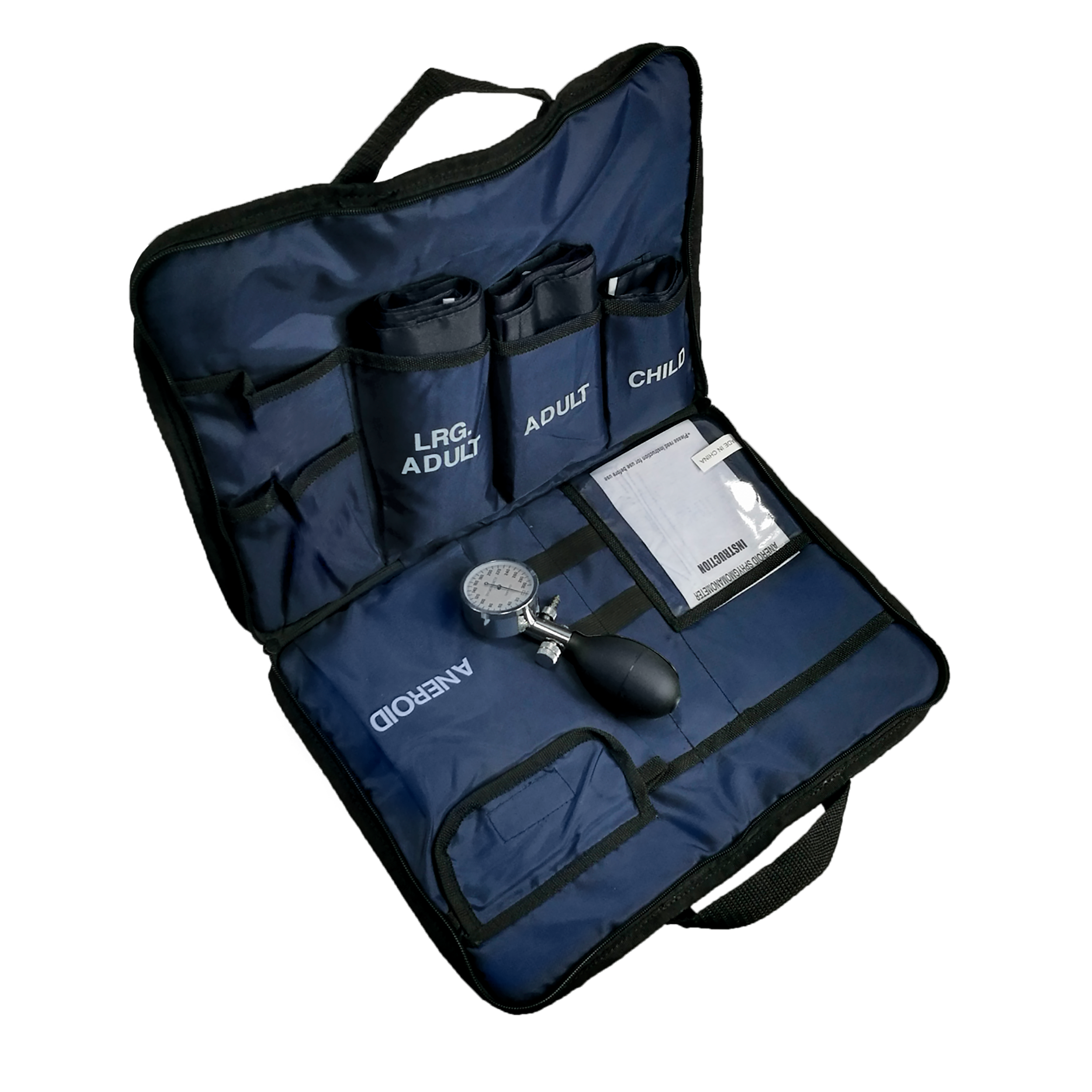 • #7097 contains: (1) multi-pocketed, heavy-duty, blue nylon zippered bag, (1) Aeroid Sphygmomanometer, (1) packet of instructions, (1) Child Cuff, (1) Adult Cuff, (1) Large Adult Cuff