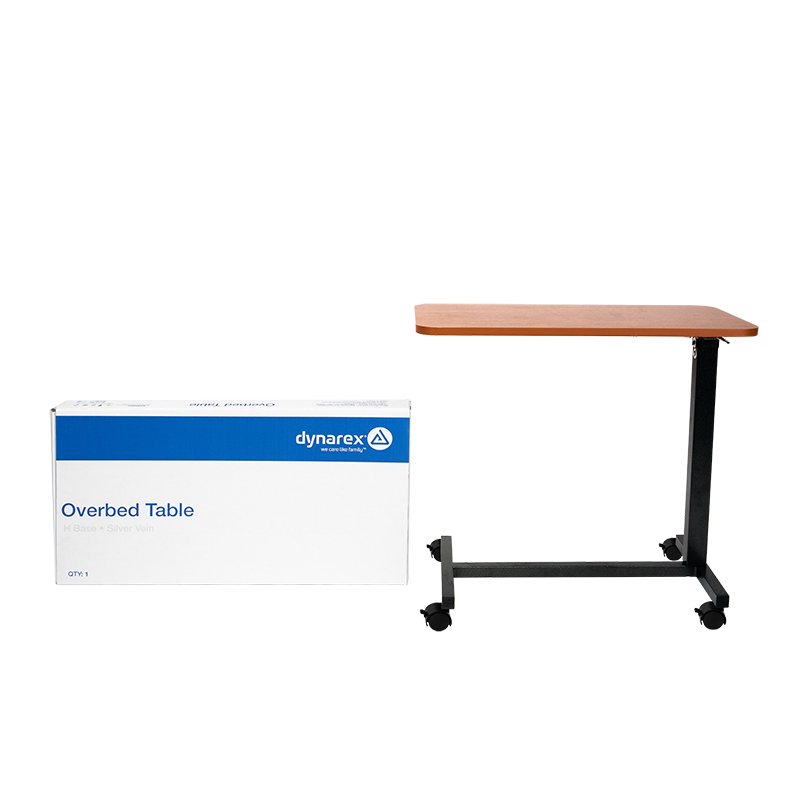 The Dynarex Overbed Table is designed for optimal convenience and accessibility. The laminate wood tabletop rolls on a height-adjustable, powder-coated base, has locking wheels, and is ideal for use in a wide range of healthcare settings.