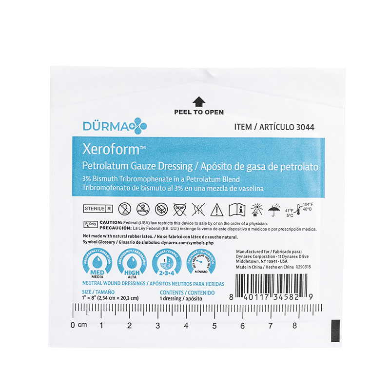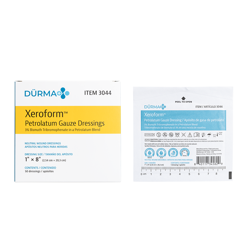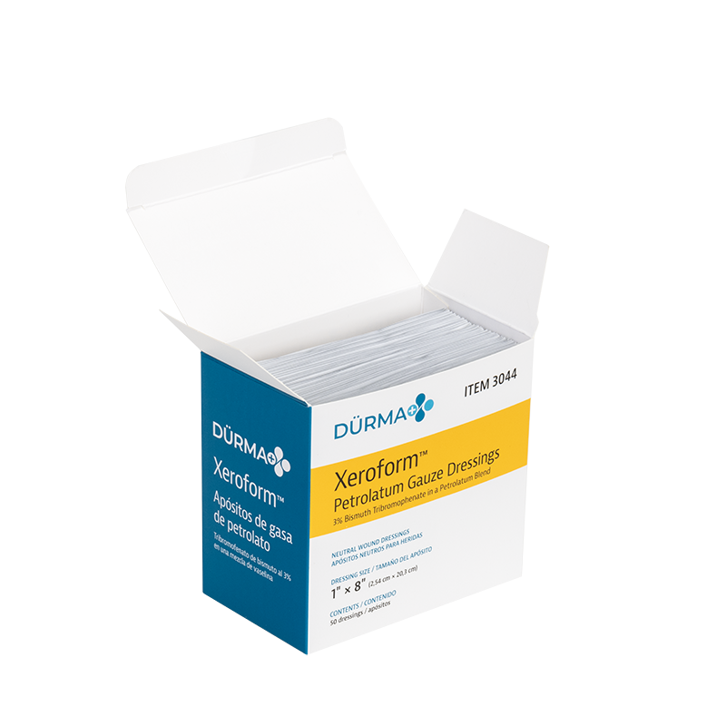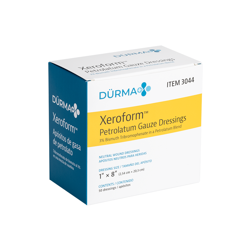 Dürma+ Xeroform Petrolatum Gauze Dressings are sterile, non-adherent, knitted gauze dressings impregnated with a blend of petrolatum, bismuth, mineral oil, and paraffin oil. These conformable, non-occlusive dressings promote airflow to the wound and are suitable for deep and shallow wounds with minimal exudate.