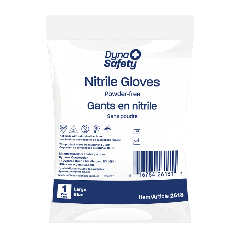 Dynarex DynaSafety Nitrile Gloves in a Bag are premium-quality, powder-free nitrile gloves crafted for optimal protection and comfort. The ambidextrous Gloves are designed with textured fingertips for increased grip and a minimum thickness of 2 mils at fingertips and palm for increased tactile sensitivity. The Gloves feature beaded cuffs to help ensure easy donning. These Gloves in a Bag have a secure fit around the wrist and hand-conforming flexibility to help prevent physical fatigue. The Nitrile Gloves are packaged in single or double pair bags. Ideal for use in a wide variety of settings, including hospitals, emergency situations, long-term care, tattoo studios, and veterinary practices.