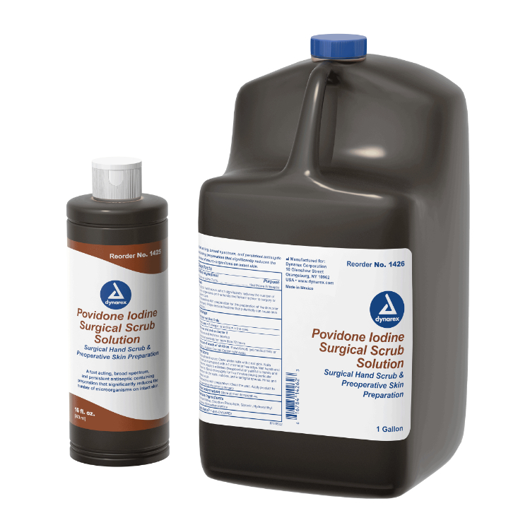 Dynarex Povidone Iodine Scrub Solution is an antiseptic solution formulated with 7.5% povidone iodine — USP equivalent to 0.75% available iodine — to provide effective cleansing and preparation of skin prior to medical procedures. This Scrub Solution is formulated to allow for efficient preoperative hand scrubbing and to help prevent infection in minor cuts, scrapes, and burns.