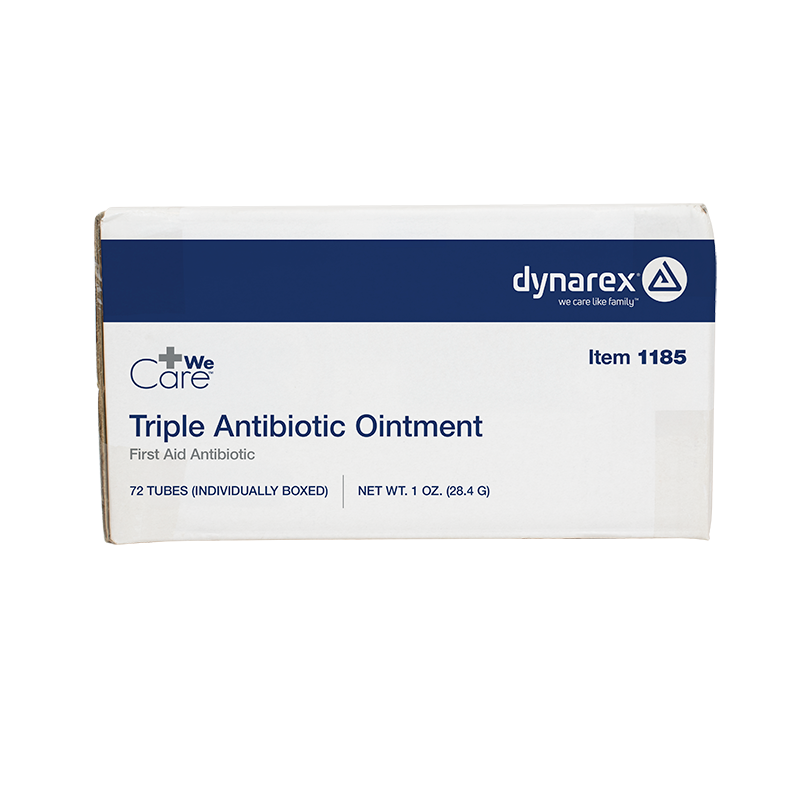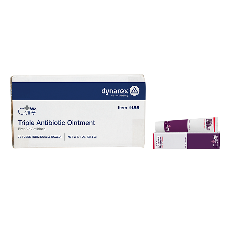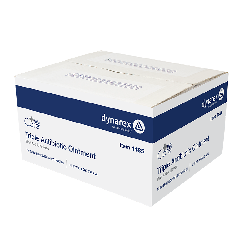 Dynarex Triple Antibiotic Ointment is a topical antibiotic designed to help minimize the risk of infection in minor cuts, scrapes, and burns. The triple-acting formula helps repair skin and inhibit the growth of harmful bacteria. This high-quality Ointment is available in convenient single-use packets for effortless kit-packing and easy-open tubes for quick application. Dynarex Triple Antibiotic Ointment is ideal for a wide variety of settings including first aid, medical practices, long-term care, schools, and at home. Compare Dynarex Triple Antibiotic Ointment to Neosporin® by Johnson & Johnson Services, Inc.