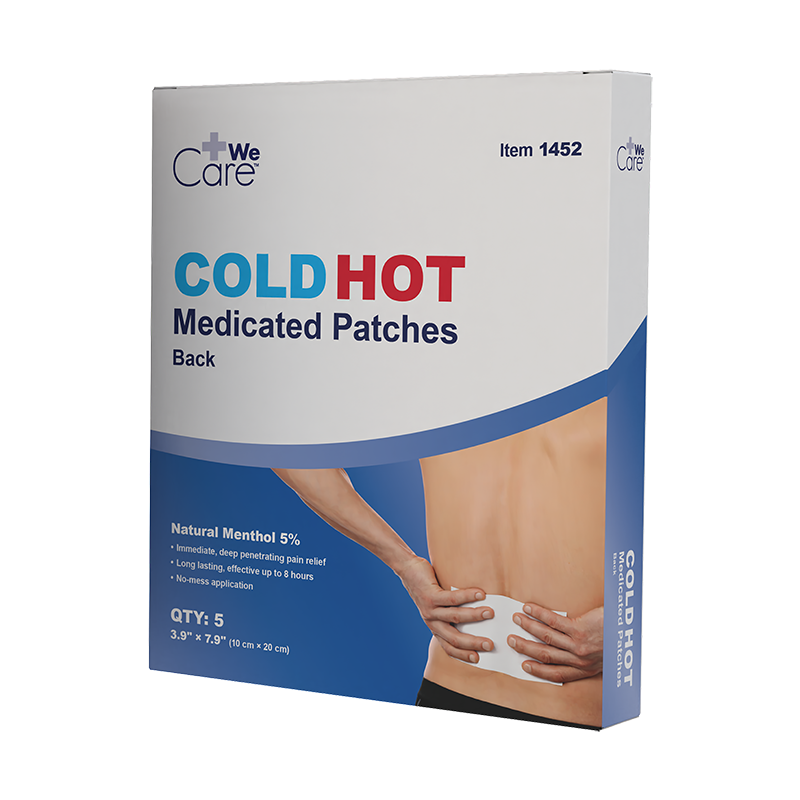 WeCare Cold Hot Medicated Patches provide fast-acting relief for muscle and joint pain with cooling menthol and soothing warmth. These self-adhering patches contour to the body for a comfortable, secure fit.