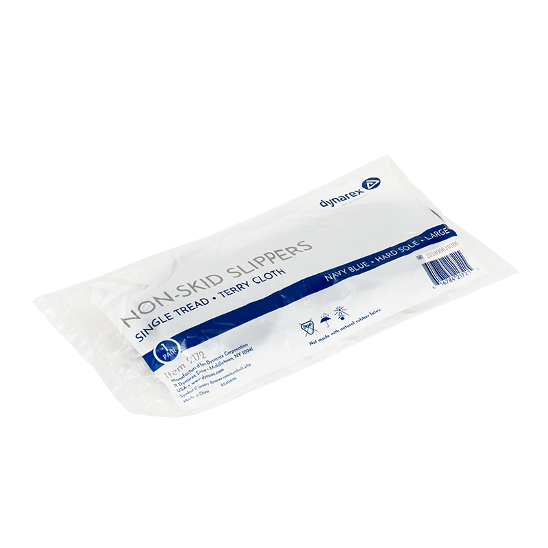 Dynarex Hard Sole Slipper Socks feature anti-skid rubber grips to help prevent patient falls. The Slipper Socks are made from soft terrycloth fabric to keep feet warm, dry, and comfortable. Dynarex Hard Sole Slipper Socks are available in a variety of styles and in color-coded sizes, including: S (Red), M (Sky Blue), L (Navy Blue), and XL (White). Each case comes packaged with 12 pairs of disposable slippers. Designed for use in clinical settings such as hospitals, long-term care facilities, and retirement homes.