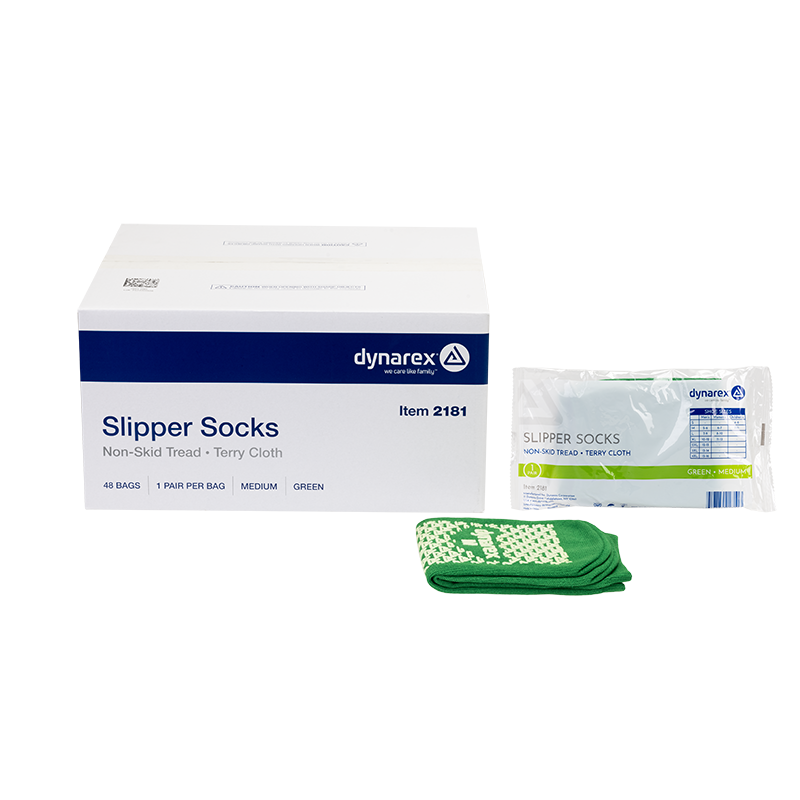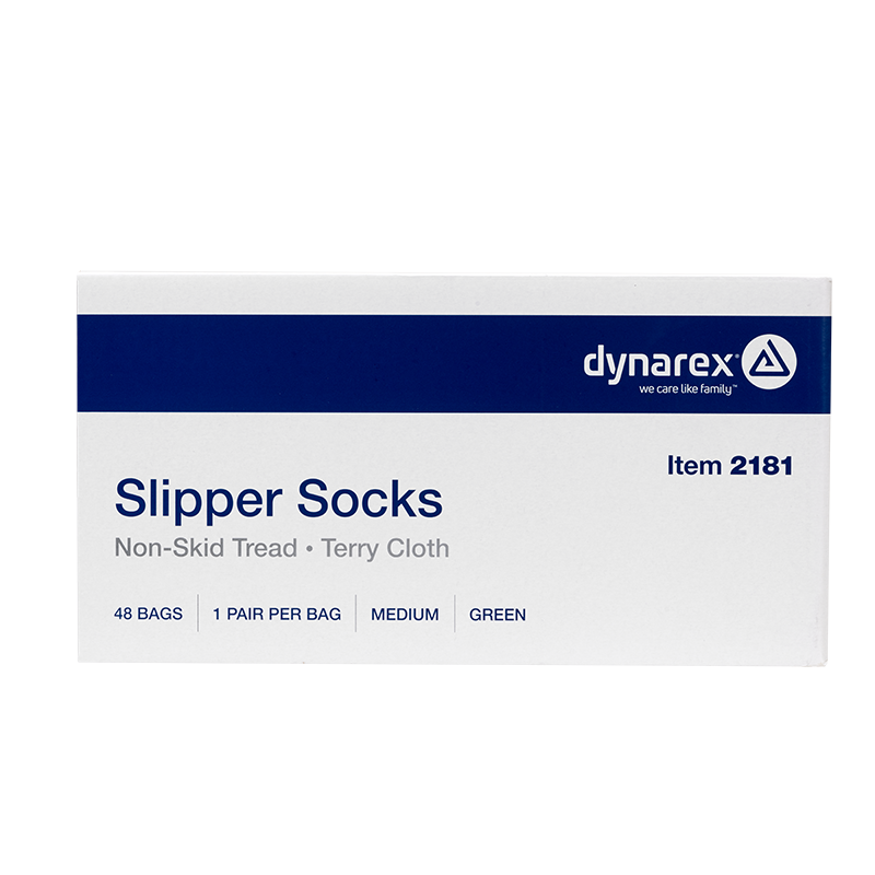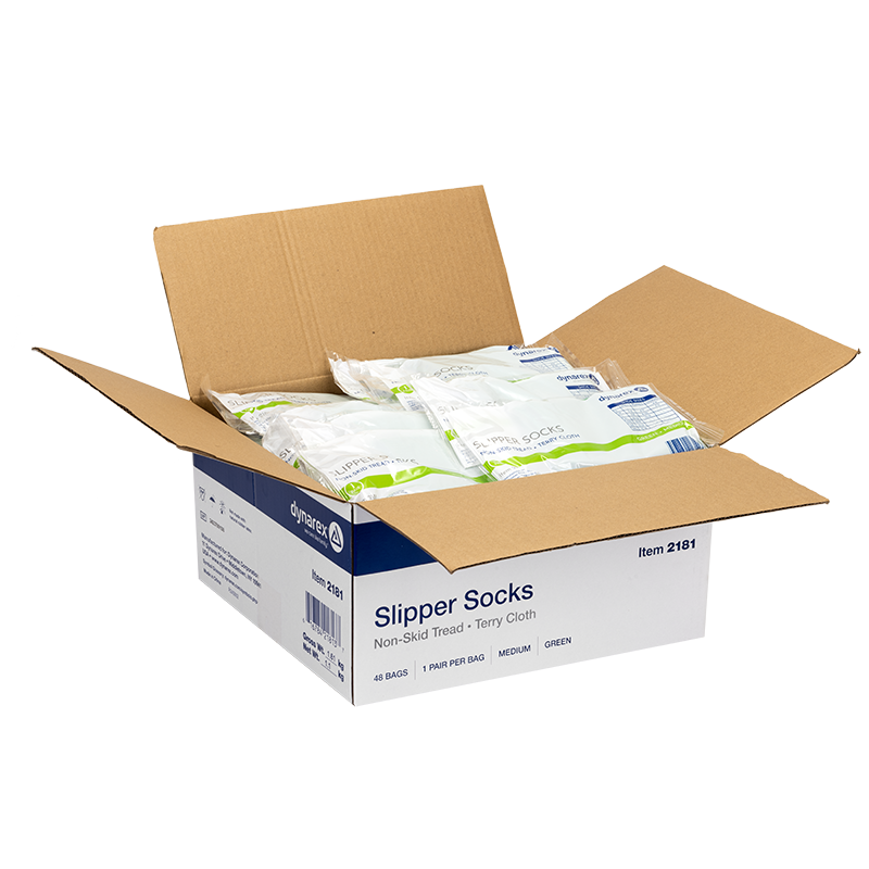 Dynarex Slipper Socks are covered with rubber grippers to help prevent patient falls. The Slippers are made of soft terrycloth to keep feet warm, dry, and comfortable. Ideal for patients in a variety of clinical and long-term care facilities.