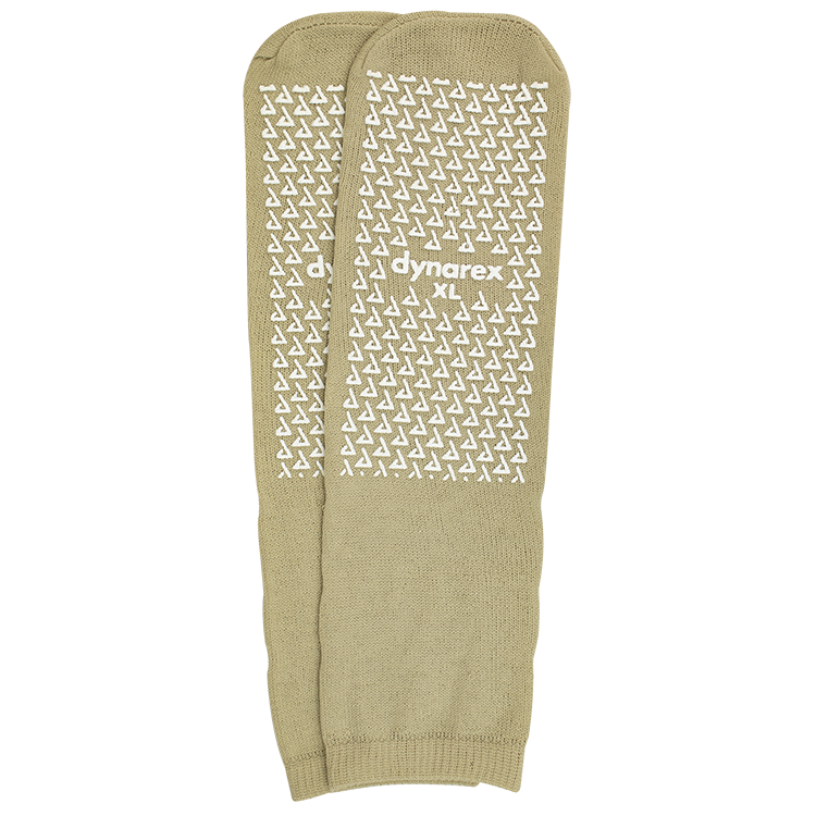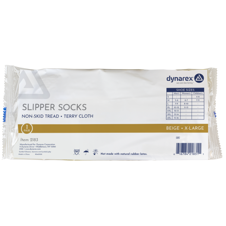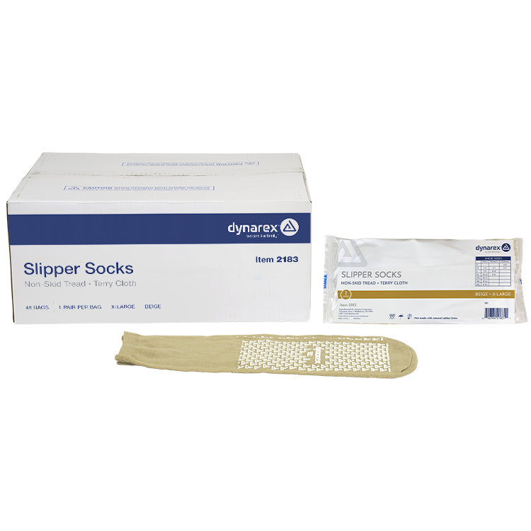 Dynarex Slipper Socks are covered with rubber grippers to help prevent patient falls. The Slippers are made of soft terrycloth to keep feet warm, dry, and comfortable. Ideal for patients in a variety of clinical and long-term care facilities.