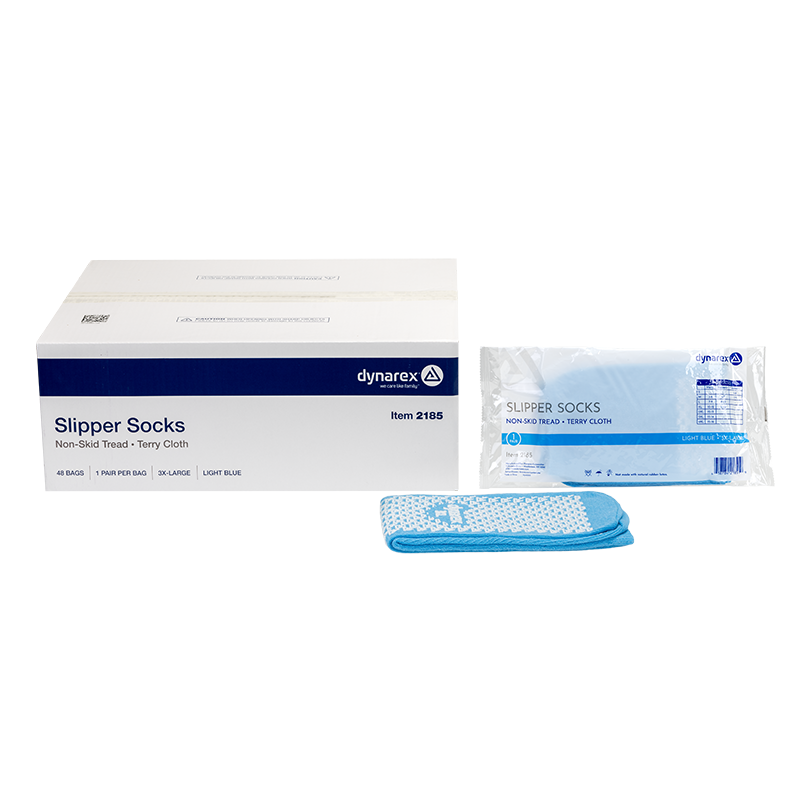 Dynarex Slipper Socks are covered with rubber grippers to help prevent patient falls. The Slippers are made of soft terrycloth to keep feet warm, dry, and comfortable. Ideal for patients in a variety of clinical and long-term care facilities.