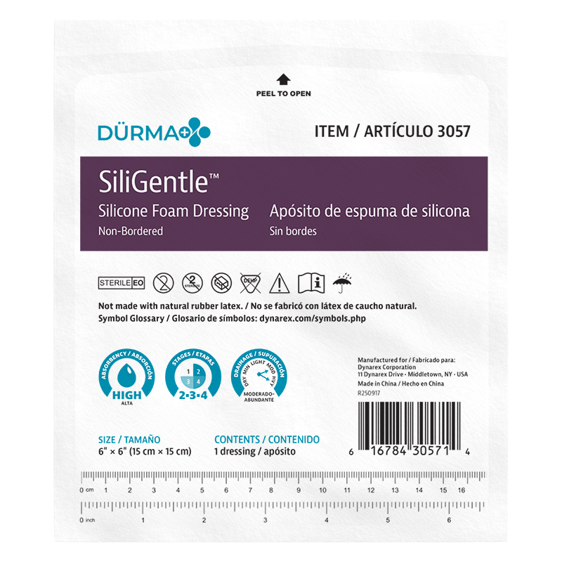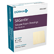 Dürma+ SiliGentle Silicone Foam Dressings are soft, highly absorbent dressings with a vapor-permeable waterproof film. Designed to lock away exudate and minimize pain and trauma, they are available in bordered and non-bordered varieties.