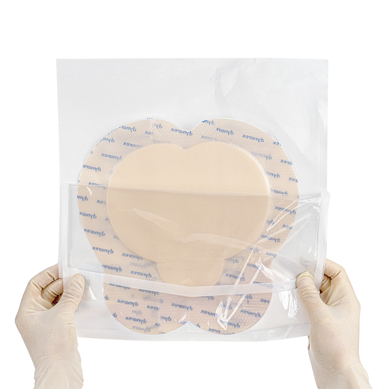 Product Material Silicone gel (transparent porous gel), SAF absorbent pad (super absorbent fiber - bordered - 200gsm), PU foam (5mm thickness (non-bordered) - 1.8mm to 2.5mm thickness (bordered)), PU film (0.015 to 0.025mm thickness - skin colored), Medical pressure sensitive adhesive (transparent liquid), PE released film (creamy white PE film printed with blue pattern)