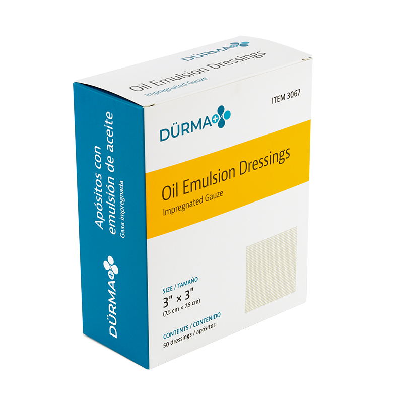 Dürma+ Oil Emulsion Dressings are sterile, non-adherent gauze dressings evenly impregnated with an emulsion blend of petrolatum and sunflower oil. This blend helps maintain a hydrated wound bed to support healing while minimizing patient discomfort. The dressings allow exudate to flow away from the wound into a secondary dressing without adhering to granulating tissue, helping reduce the risk of skin maceration. Dürma+ Oil Emulsion Dressings are non-occlusive primary dressings intended for use on low-exuding wounds such as donor sites, lacerations, skin grafts, and abrasions. Best used beneath an absorbent secondary dressing for wound stages 2, 3, or 4.