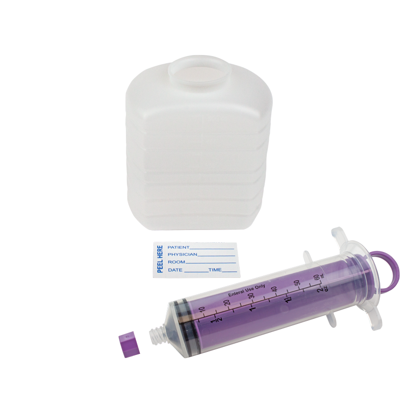 Individually packaged enteral feeding syringes can be hung from an IV pole.