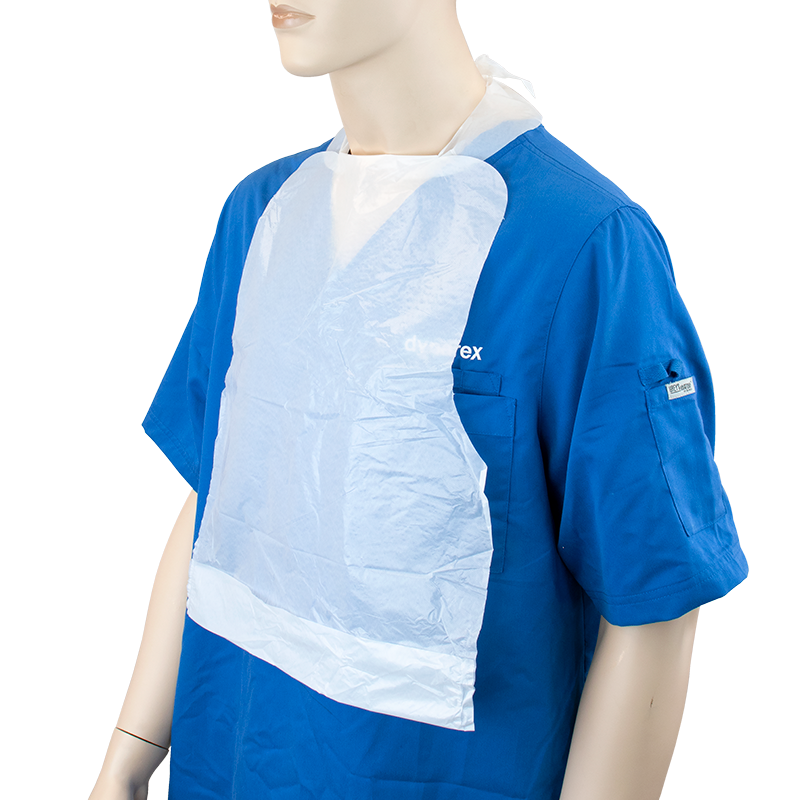 Dynarex Polyethylene Bibs are high-quality, disposable bibs designed for optimal protection and convenience in medical environments, long-term care facilities, and home settings. Constructed from durable polyethylene plastic, these bibs offer reliable coverage while helping to contain spills and debris. Each bib is designed with a built-in crumb-catching pocket for easy cleanup, enhancing hygiene and efficiency.