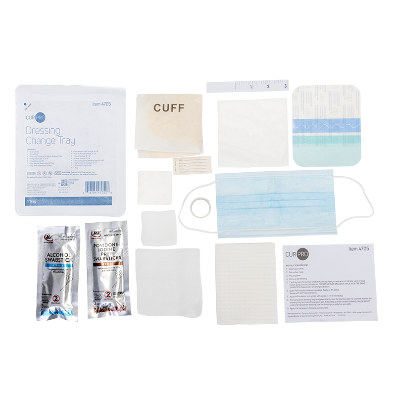 - Contents: (1)Instructions; (1)Non-Woven Face Mask; (1)Pair Vinyl Gloves with Wallet, Powder Free; (1)Polylined Drape, 13" × 18"; (1)Tape Measure, 36"; (3)Alcohol Swabsticks; (3)PVP Swabsticks; (1)Non-Woven Split Sponge, 4" × 4"; (1)Non-Adherent Sponge, 2" × 2"; (1)Gauze Sponge, 2" × 2"; (1)Gauze Sponge, 4" × 4"; (1)Roll Transparent Dressing Tape, ¾" × 18"; (1) Transparent Dressing, 4" × 4 ¾"; (1)Dressing Change Label