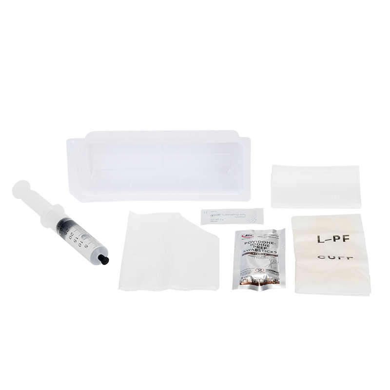 Contents (1) Graduated collection basin; (1) Underpad; (1) Syringe, 10cc or 30cc, pre-filled with sterile water; (1) Lubricating jelly; (3) PVP swabsticks; (1) Fenestrated drape; (1) Powder-free, cuffed vinyl exam gloves