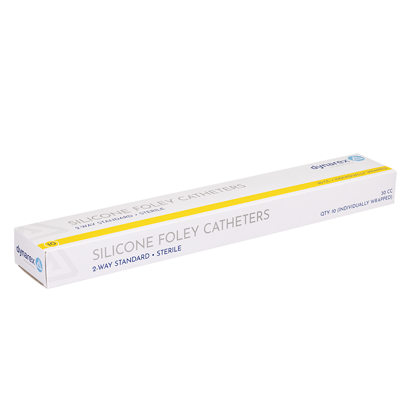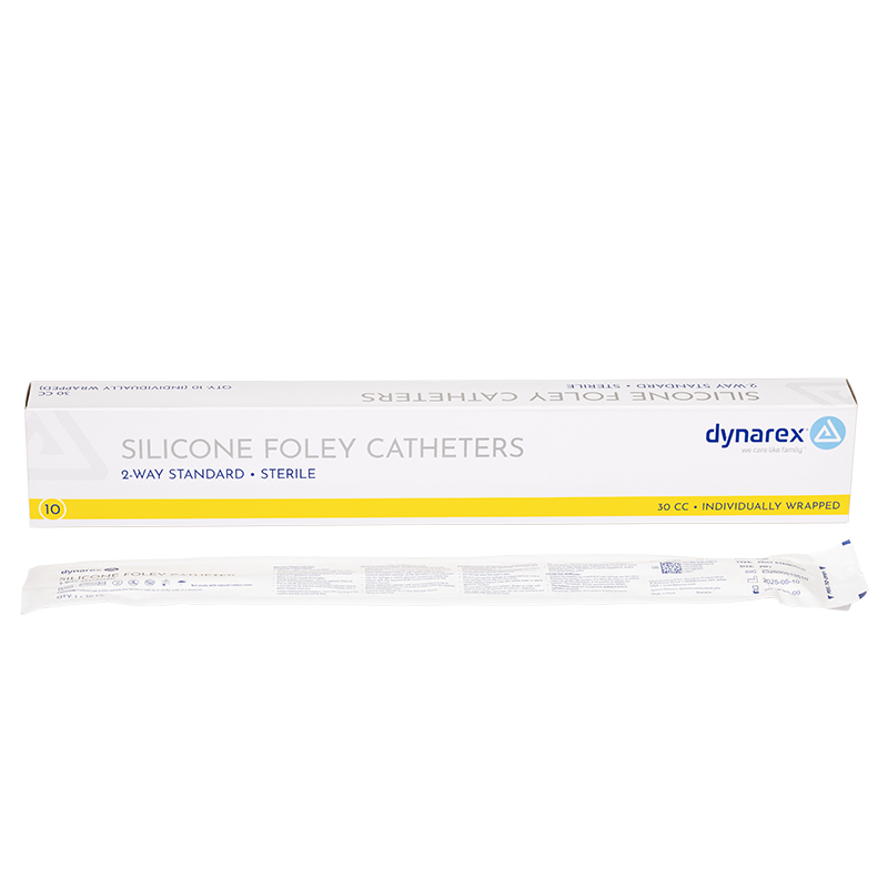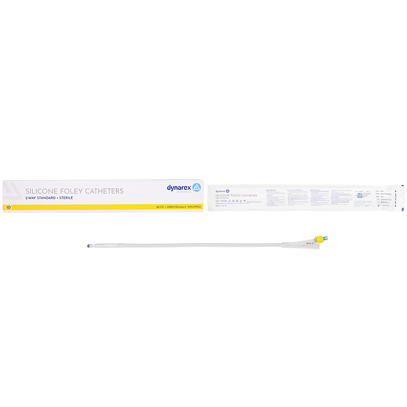 Dynarex Silicone Foley Catheters feature a 2-way design with smooth drainage eyes and a clear silicone body for easy visualization. Constructed for reliable performance and enhanced patient comfort during extended indwelling use.