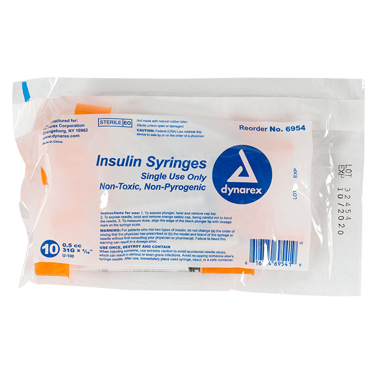 Dynarex Insulin Syringes are high-quality hypodermic syringes designed to deliver insulin effectively and precisely. Each sterile, disposable syringe is securely attached to prevent needle pop-off and features a stainless-steel needle that is coated with medical-grade lubricant and a double-beveled tip for smoother insertion. The transparent barrel is clearly marked with bold font for accurate dose measurement.