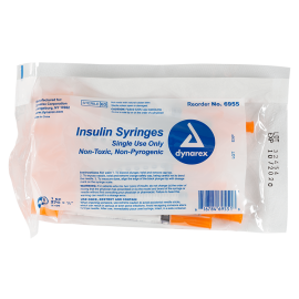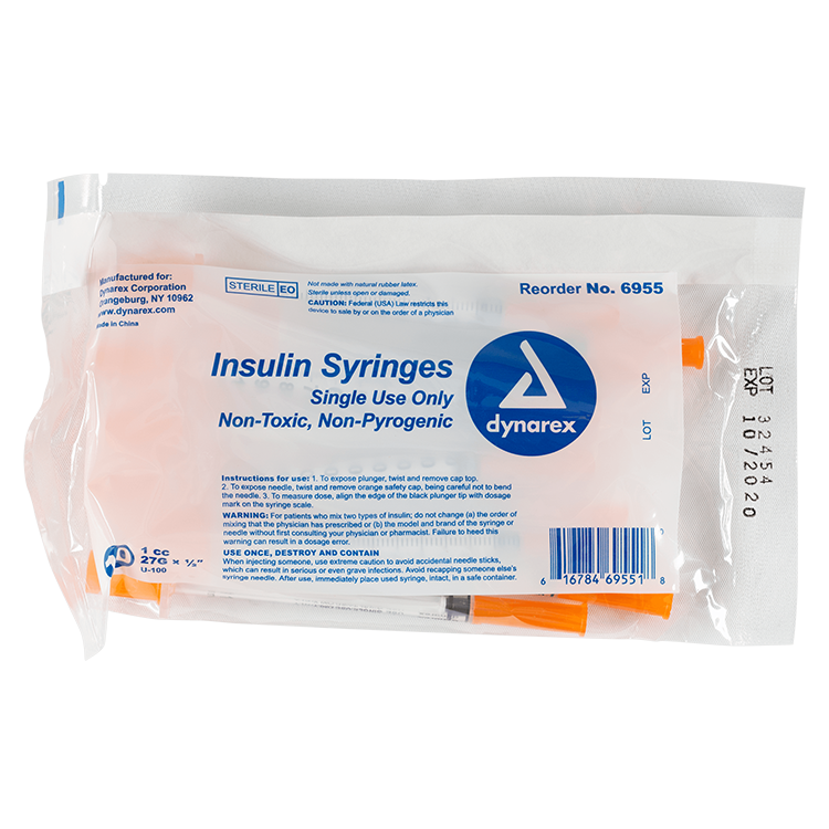 Dynarex Insulin Syringes are high-quality hypodermic syringes designed to deliver insulin effectively and precisely. Each sterile, disposable syringe is securely attached to prevent needle pop-off and features a stainless-steel needle that is coated with medical-grade lubricant and a double-beveled tip for smoother insertion. The transparent barrel is clearly marked with bold font for accurate dose measurement.