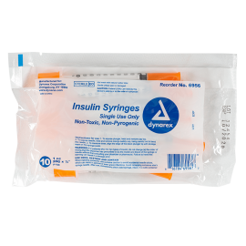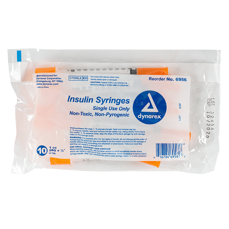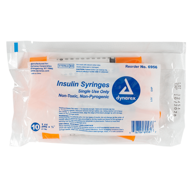 Dynarex Insulin Syringes are high-quality hypodermic syringes designed to deliver insulin effectively and precisely. Each sterile, disposable syringe is securely attached to prevent needle pop-off and features a stainless-steel needle that is coated with medical-grade lubricant and a double-beveled tip for smoother insertion. The transparent barrel is clearly marked with bold font for accurate dose measurement.