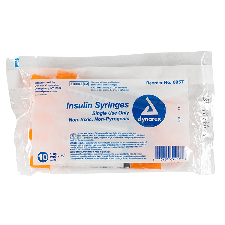 Dynarex Insulin Syringes are high-quality hypodermic syringes designed to deliver insulin effectively and precisely. Each sterile, disposable syringe is securely attached to prevent needle pop-off and features a stainless-steel needle that is coated with medical-grade lubricant and a double-beveled tip for smoother insertion. The transparent barrel is clearly marked with bold font for accurate dose measurement.