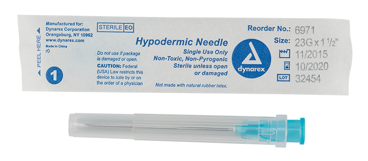 Dynarex Hypodermic Needles are sterile, thin-walled needles designed to provide safe, effective blood draws and medication administration. Each needle features a double-bevel tip to support smooth penetration, efficient delivery, and improved patient comfort. A color-coded hub allows for quick identification of needle gauge, while compatibility with both luer lock and luer slip connections provides versatile attachments options.
