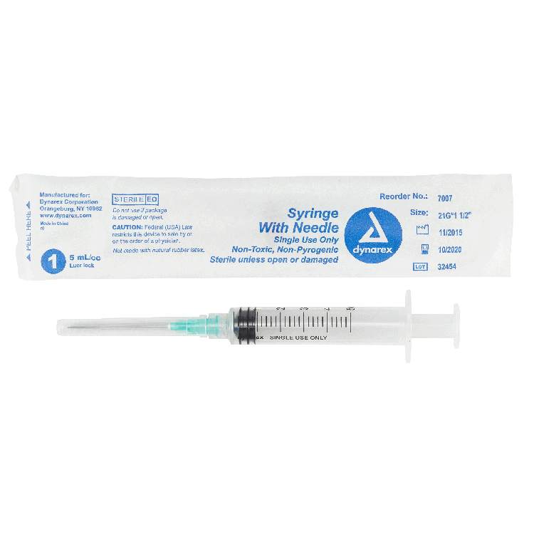 The Dynarex Syringe with Needle features a high-quality, thin-walled needle designed with a double-beveled tip for smooth insertion and added comfort during injections. The Syringe’s transparent polypropylene barrel with bold-font numbering allows for easy measurement and accurate medication dosing.