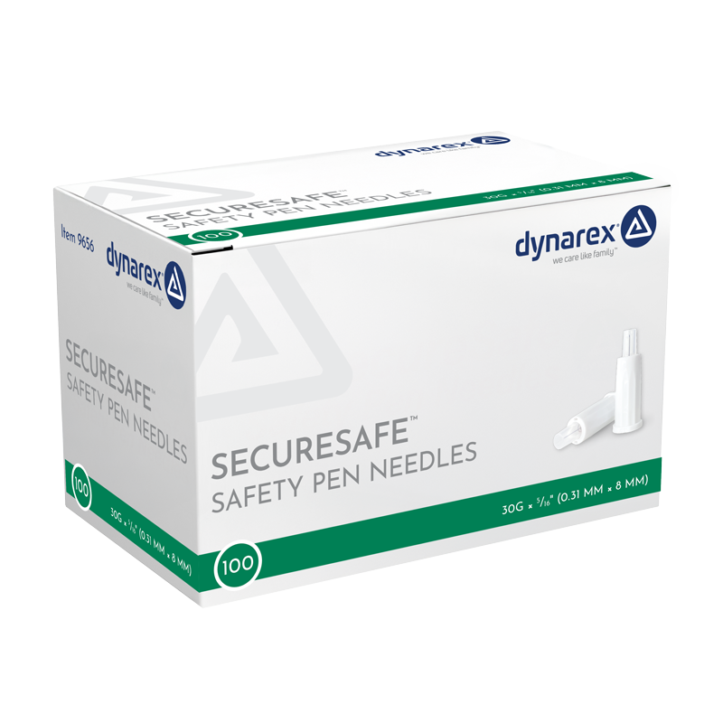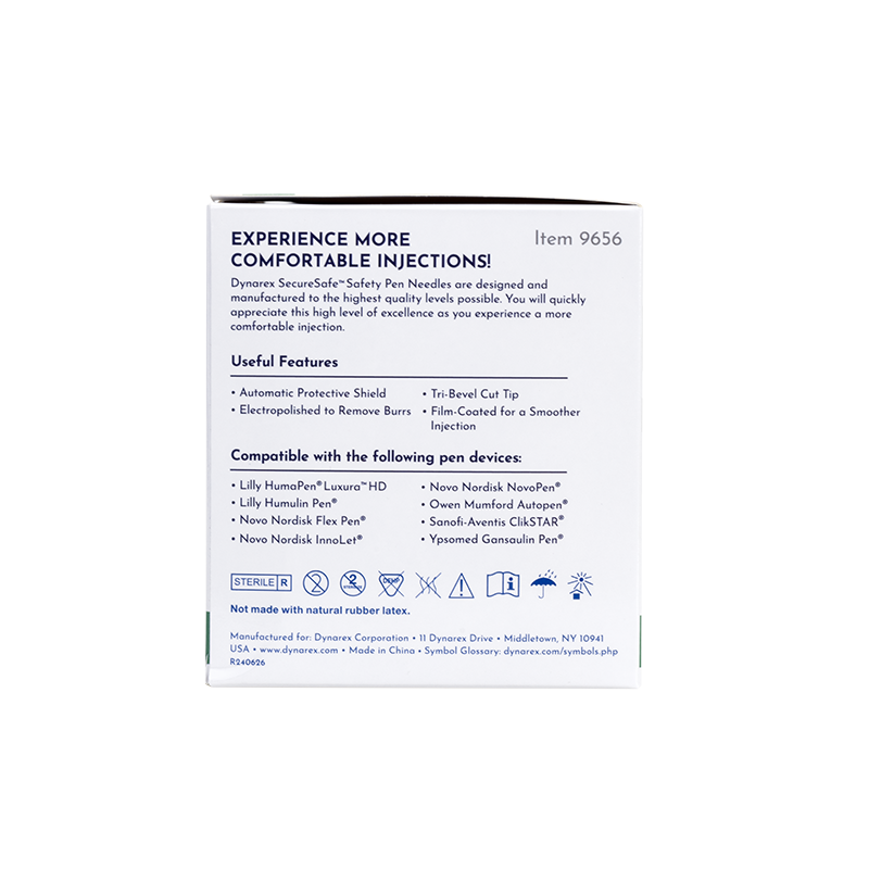 The Dynarex SecureSafe Safety Pen Needle is individually packaged, sterilized, and is compatible with most insulin pens. It features a protective sheath that the needle retracts into when not in use. The lubricated needle head provides smooth injections at any injection site. Ideal for use in a wide range of healthcare settings.