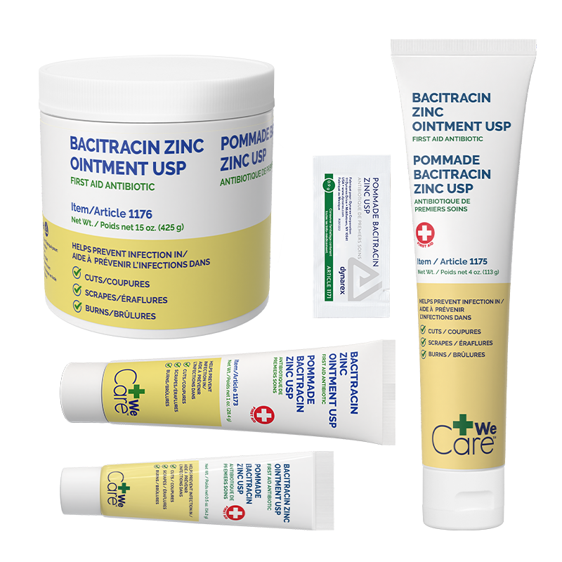 Dynarex Bacitracin Zinc Ointment USP is a topical antibiotic designed to help minimize the risk of infection in minor cuts, scrapes, and burns. The premium bacitracin and zinc formula acts as an antimicrobial agent to help inhibit the growth of bacteria. This high-quality Ointment is available in convenient single-use packets for effortless kit-packing, and easy-open tubes and jars for quick application. Dynarex Bacitracin Zinc Ointment is ideal for a wide variety of settings including first aid and emergency, long-term care, and at home.
