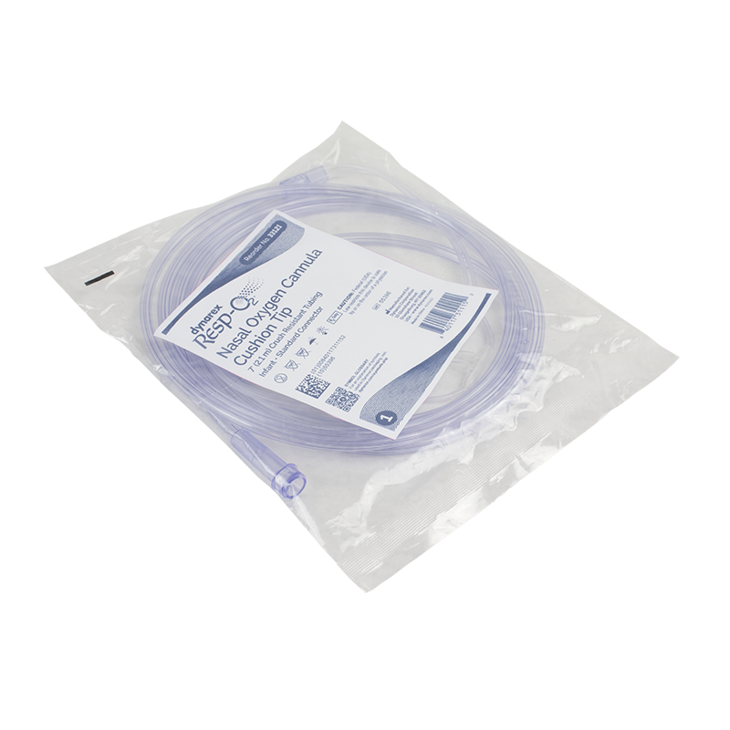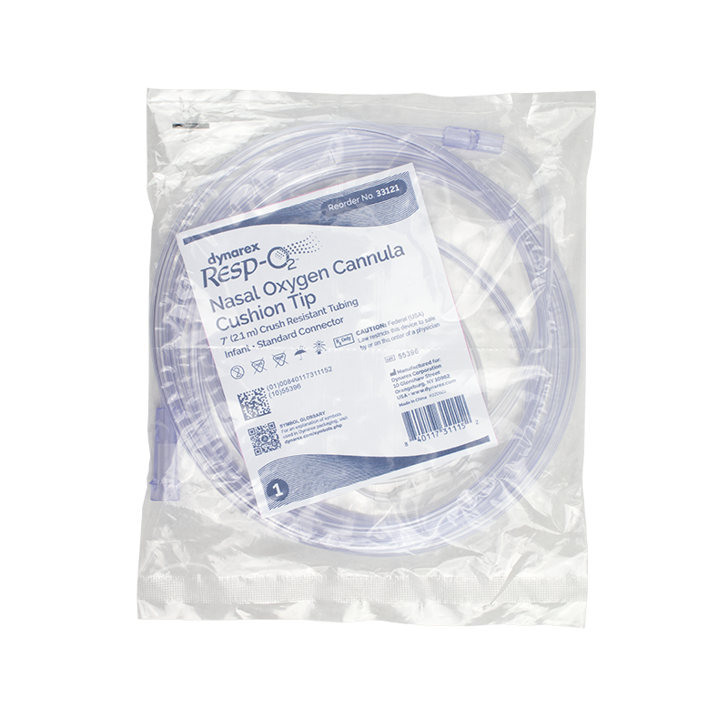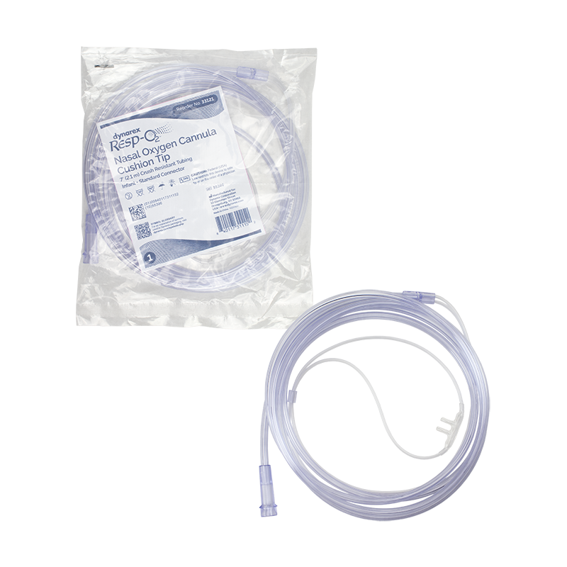Dynarex Resp-O2 Nasal Oxygen Cannulas with Cushion Tips are designed to efficiently deliver supplemental oxygen to respiratory patients. The cannulas come with either Standard or Universal connectors and feature light green oxygen supply tubing, designed to help improve tube visibility.