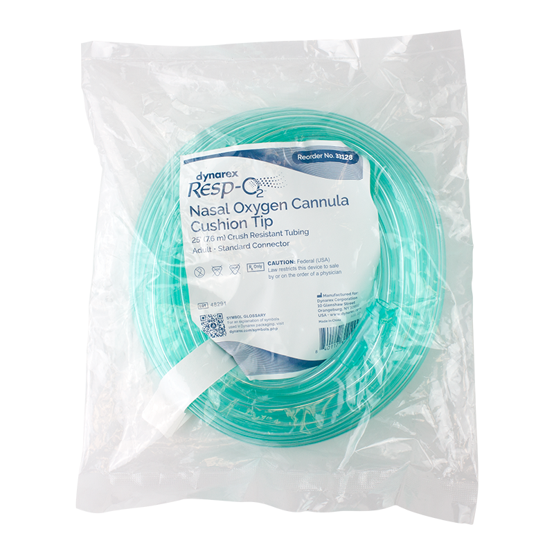 Dynarex Resp-O2 Nasal Oxygen Cannulas with Cushion Tips are designed to efficiently deliver supplemental oxygen to respiratory patients. The cannulas come with either Standard or Universal connectors and feature light green oxygen supply tubing, designed to help improve tube visibility.