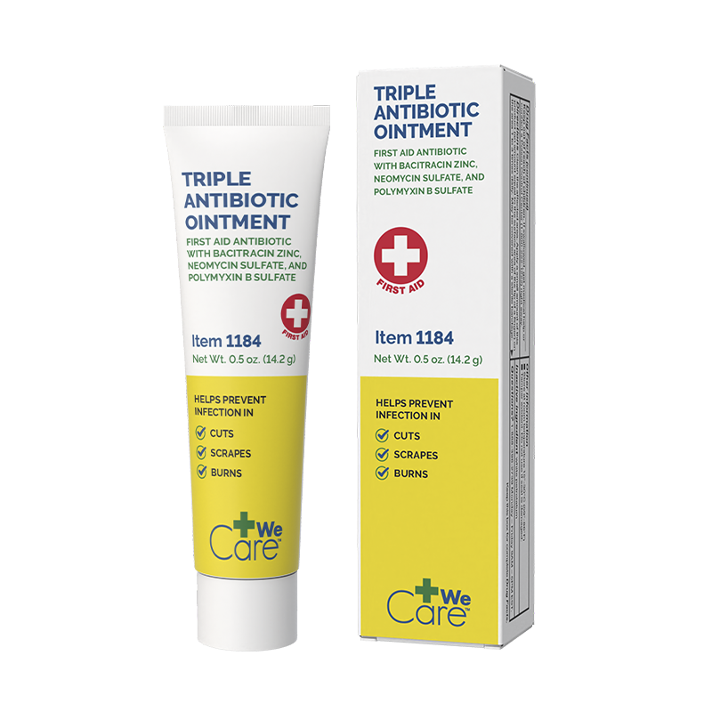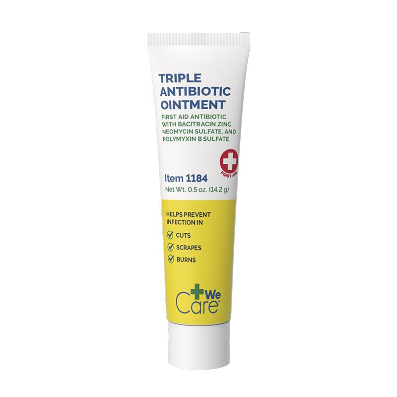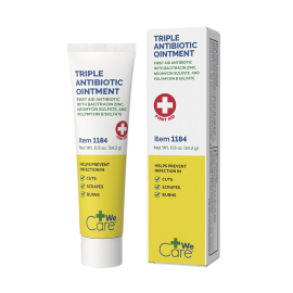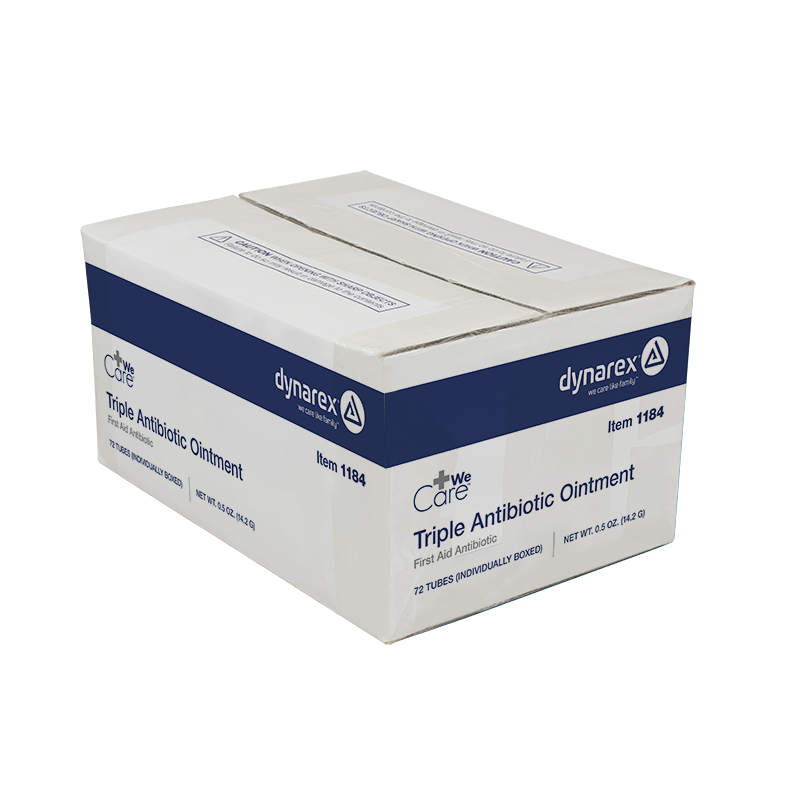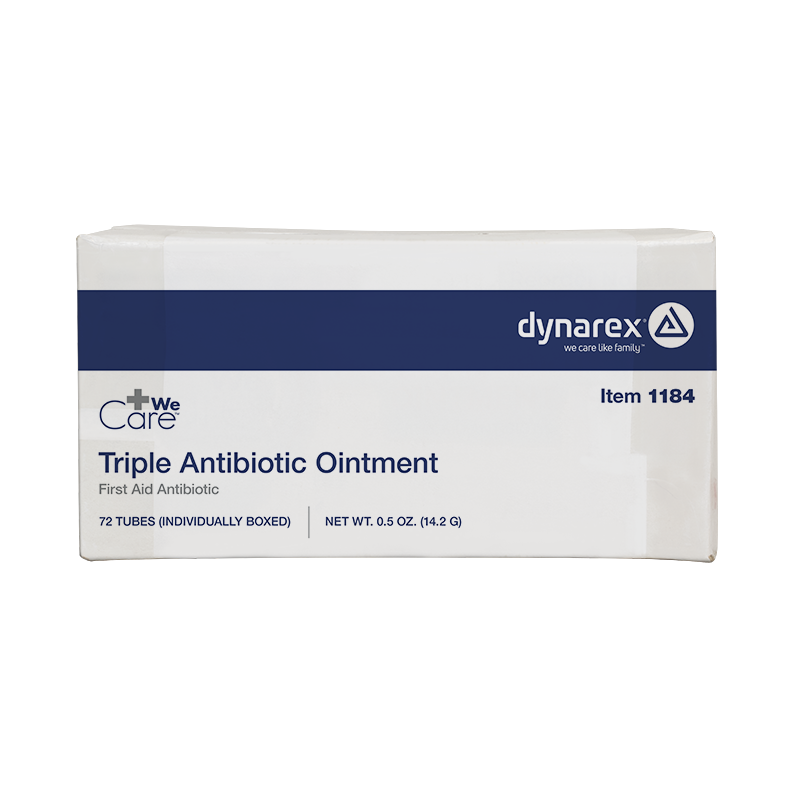 WeCare Triple Antibiotic Ointment is a topical antibiotic designed to help minimize the risk of infection in minor cuts, scrapes, and burns. The triple-acting formula helps repair skin and inhibit the growth of harmful bacteria. This high-quality Ointment is available in convenient single-use packets for effortless kit-packing and easy-open tubes for quick application. Dynarex Triple Antibiotic Ointment is ideal for a wide variety of settings including first aid, medical practices, long-term care, schools, and at home.