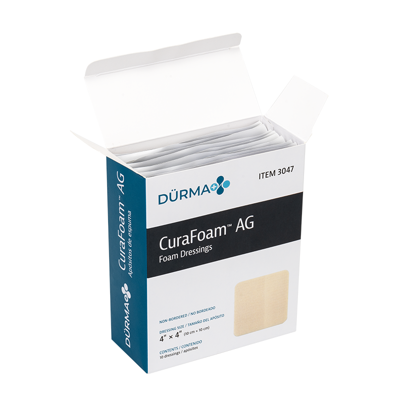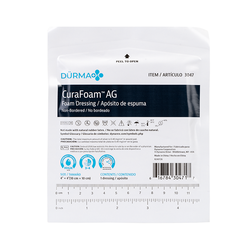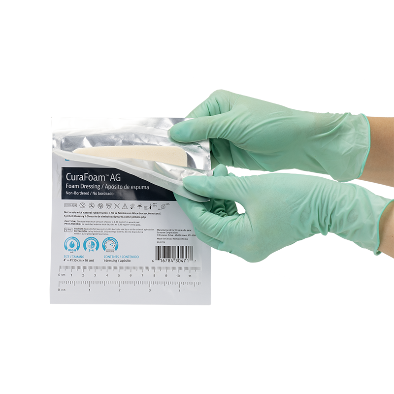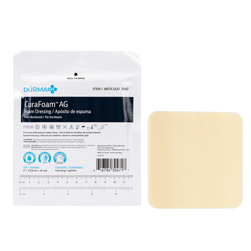 Dynarex’s CuraFoam AG Silver Foam Dressings are sterile, non-adherent, highly absorbent foam dressings infused with silver ions to provide excellent exudate management with antimicrobial effects. The dressing enables optimal wound handling to support and maintain a moist wound environment, with continuous antimicrobial protection for exuding wounds with delayed healing due to bacteria.