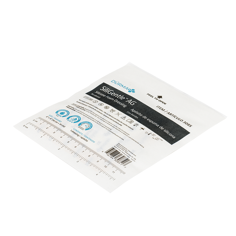 Product Material Main Foam pad (white or light brown polyurethane foam containing silver compounds - content is about 40%~60% in the dressing), Silicone gel contact layer (Transparent and perforated silicone gel - content is about 25~40% in the dressing), Backing film (Skin color and vapor permeable waterproof polyurethane film - content is about 3~5% in the dressing), PE release film (Transparent polyethylene film - content is about 10~17% in the dressing)