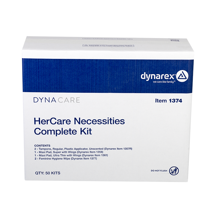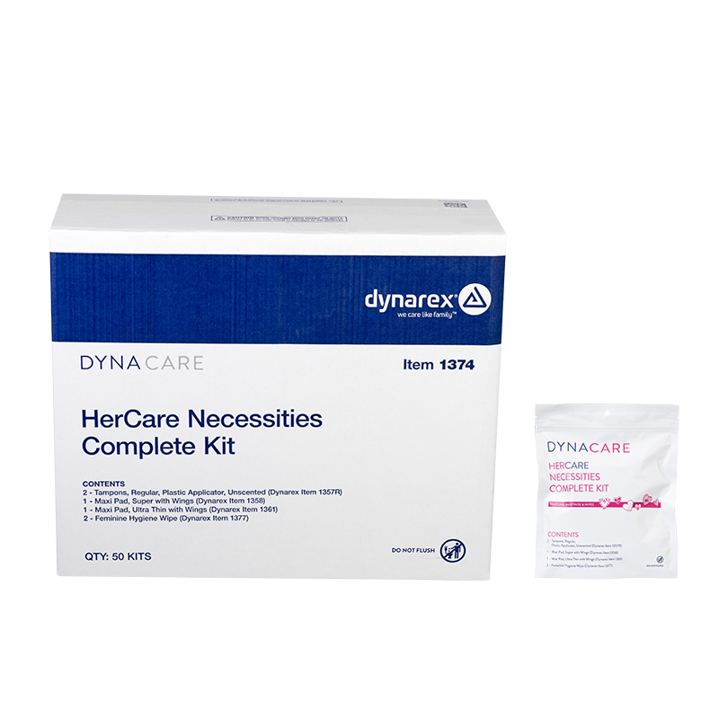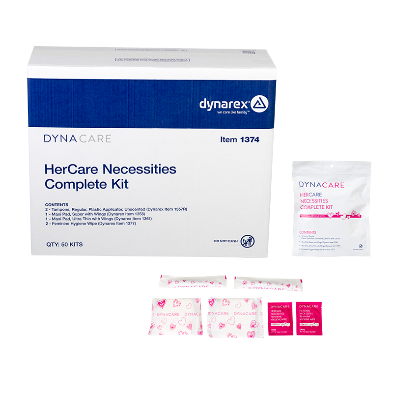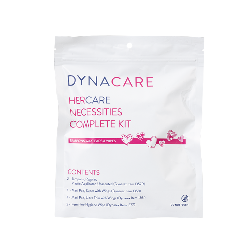 DynaCare HerCare Necessities Kits are convenient, portable kits equipped with essentials for managing menstrual flow confidently. The kits are available in two configurations for comprehensive period care, all discretely packed in a resealable plastic pouch. The complete kit (1374) features tampons with a smooth plastic applicator and maxi pads in two absorbencies — super and ultra-thin — all with wings for enhanced protection. The standard kit (1375) focuses exclusively on maxi pads, providing two levels of absorbency with wings. Both varieties include hygiene wipes for gentle cleansing. These compact kits are ideal for travel, work, or everyday use.