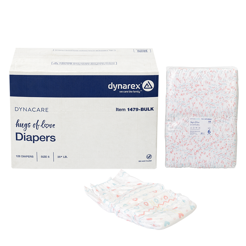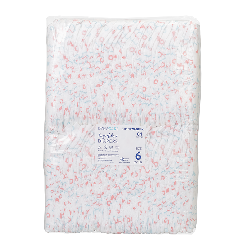 DynaCare Hugs of Love Diapers are designed from soft, breathable materials with a highly absorbent core, offering reliable protection and gentle comfort for delicate skin. The diapers feature a convenient wetness indicator to allow for easy monitoring.