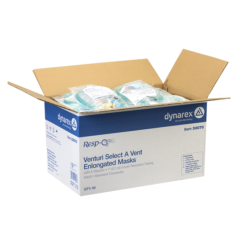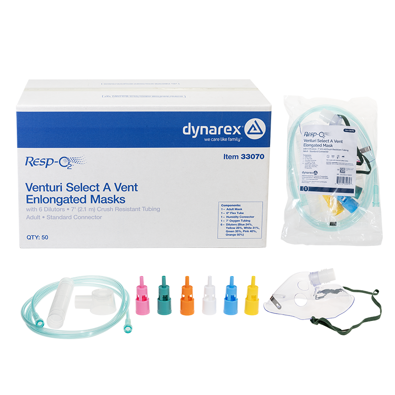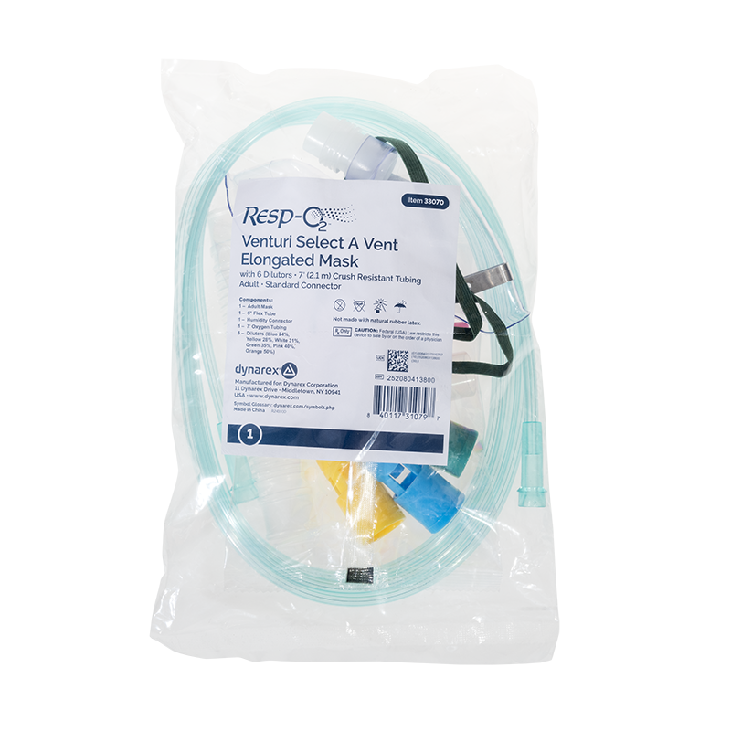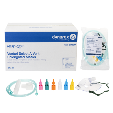 Resp-O2™ Venturi Masks provide an ideal system for delivering controlled concentrations of supplemental oxygen to suit a wide variety of patient needs. Each mask includes 7 feet of kink-resistant, star lumen tubing to allow oxygen to flow freely. The transparent vinyl masks feature smooth edges, adjustable nose clips, and elastic straps for easy adjustment and a secure, non-binding seal. Masks are equipped with either color-coded dilutor jets or an adjustable dial for precise oxygen regulation.