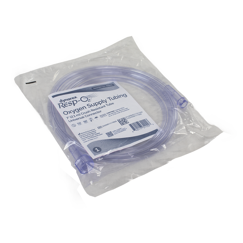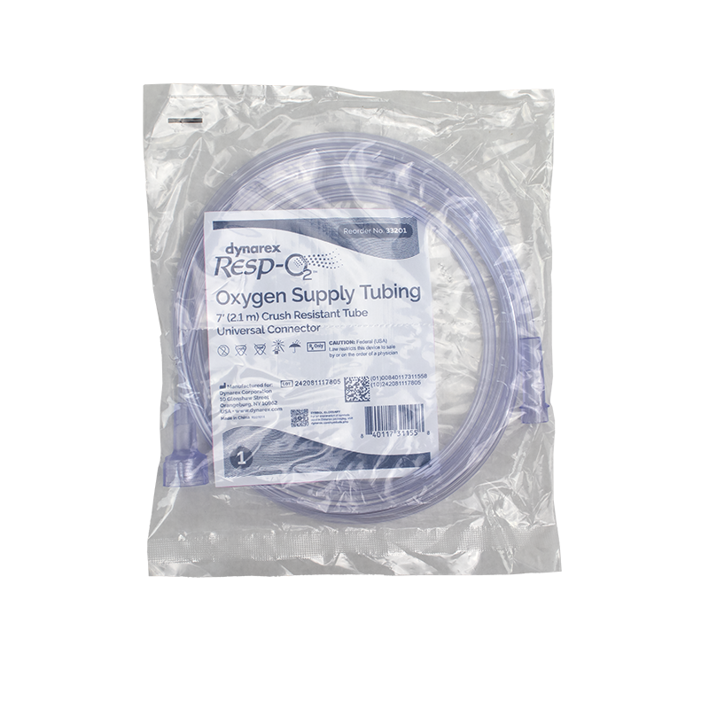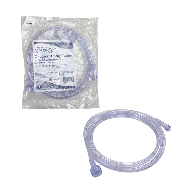 Dynarex Resp-O2 Oxygen Supply Tubing is designed to extend a patient’s reach when accessing a concentrated oxygen source for respiratory therapy. The clear and green tubing is designed to help improve tube visibility. It comes with a standard connector on one end and either a standard or universal connector on the other.