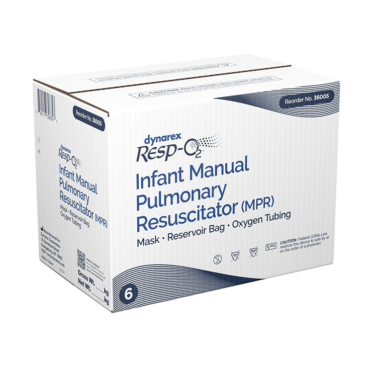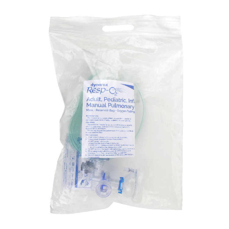 Dynarex Resp-O2 Manual Pulmonary Resuscitators (MPR) are premium-grade medical devices designed for resuscitation and life support measures performed by qualified medical professionals. The lightweight, single-patient MPR bag features a textured design to provide a non-slip grip and comes pre-assembled with 10 feet of oxygen tubing and soft cushioned facial mask.