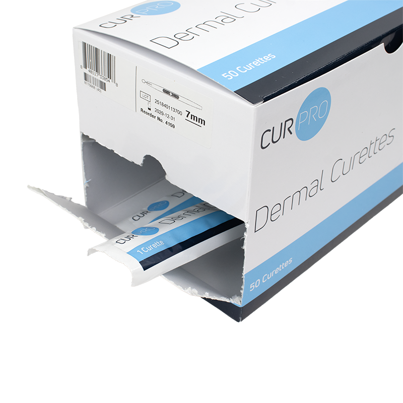 CurPro Dermal Curettes are engineered for precise and effective dermal curettage, making them ideal for a variety of routine procedures. Crafted from high-quality stainless steel, these curettes feature an extremely sharp, single-sided cutting edge for optimal performance. The ergonomically designed, textured handle provides a comfortable and secure grip, reducing hand fatigue during extended use. For added safety, each curette includes a rigid, closed-end translucent blade guard. Available in multiple sizes, the curettes are clearly marked for easy identification for optimal convenience in clinical settings.