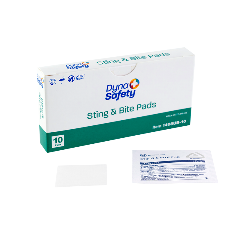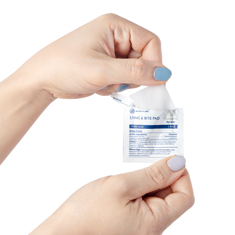 Dynarex DynaSafety Sting & Bite Pads are premium-quality wipes designed to temporarily relieve pain and irritation associated with insect stings and bites. These Bite Pads are packed in easy-to-open packets for quick access, and feature a compact size for convenient storage and portability in travel bags, first-aid kits, and backpacks.