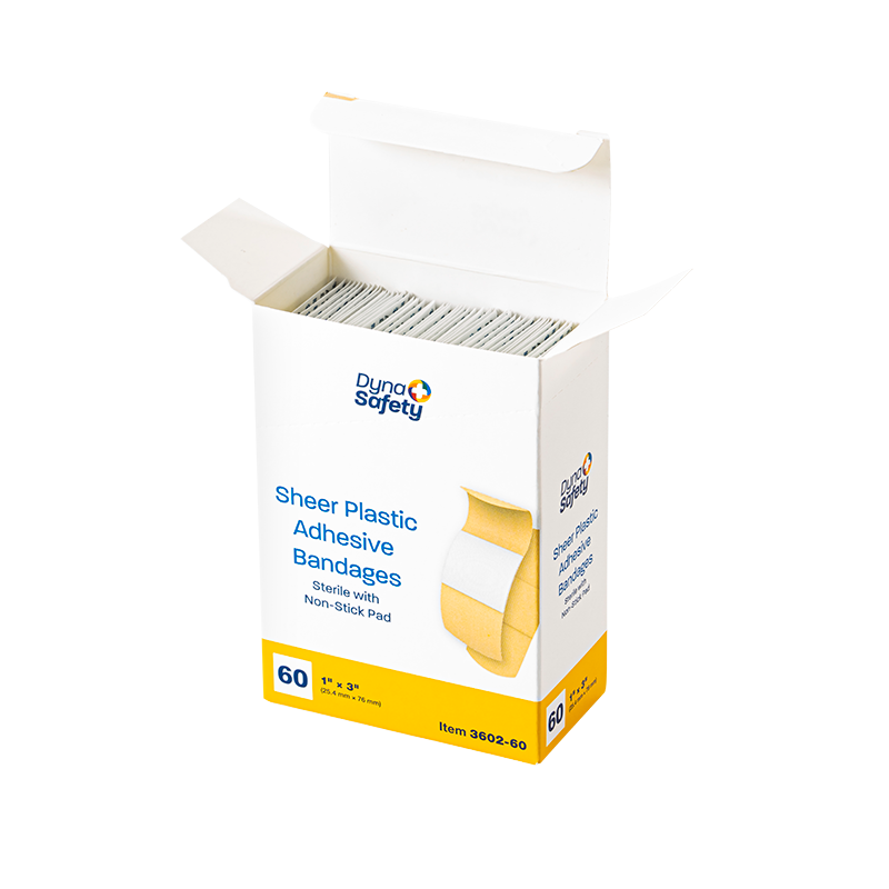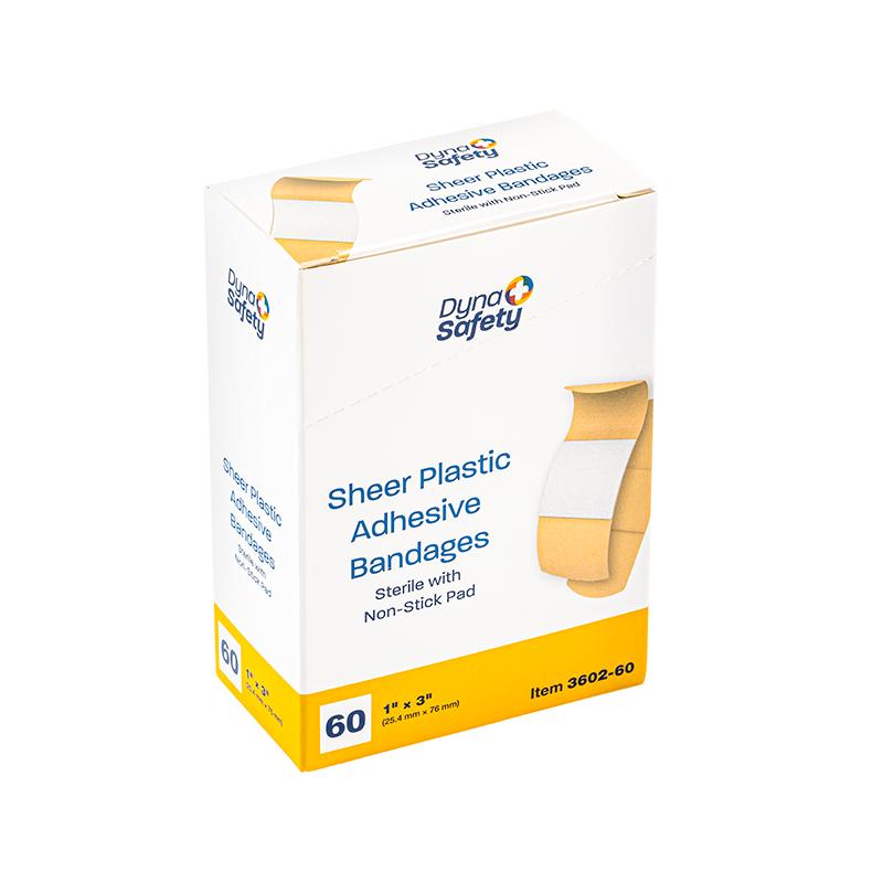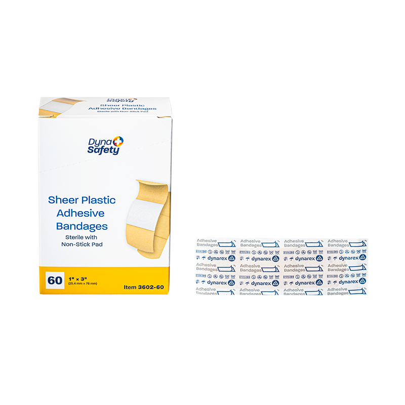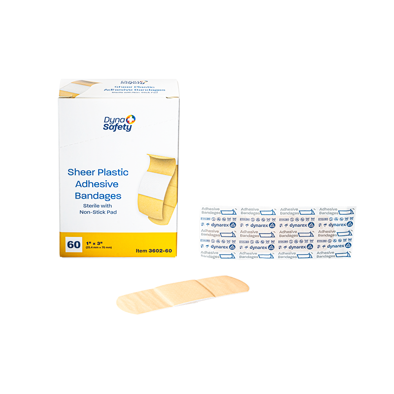 Dynarex DynaSafety Sheer Plastic Adhesive Bandages are sheer plastic bandages designed to protect minor cuts and abrasions. The Bandages are constructed with ventilated plastic to allow for improved breathability and long-lasting adhesive to help hold bandage securely in place. Each Bandage features an absorbent, non-stick pad to cushion the wound area for optimal comfort when changing dressings. These sterile Bandages are packaged in dispenser boxes for convenient handling.