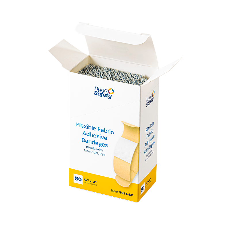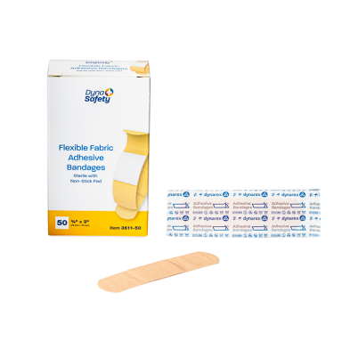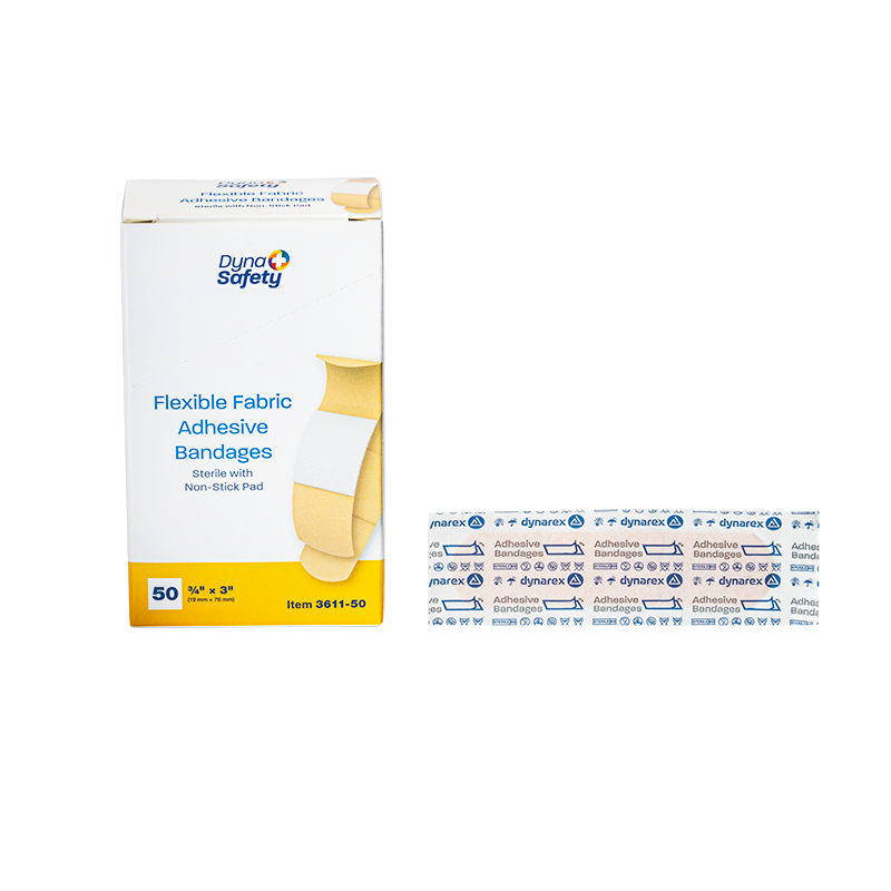 DynaSafety Adhesive Fabric Bandages are sterile adhesive bandages designed to provide stretch and breathability while covering and protecting minor wounds.